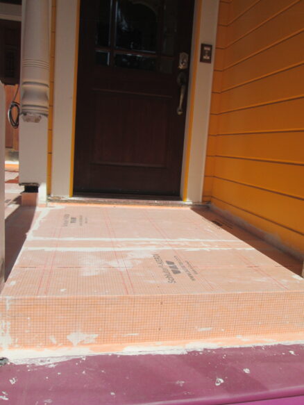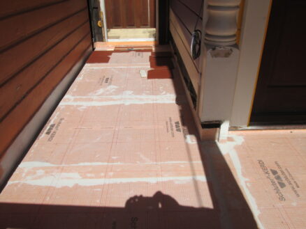 First I had to get the landing waterproofed. I used Kerdi membrane – same as for showers. The part that’s a bit difficult to deal with is the transition at the edge.