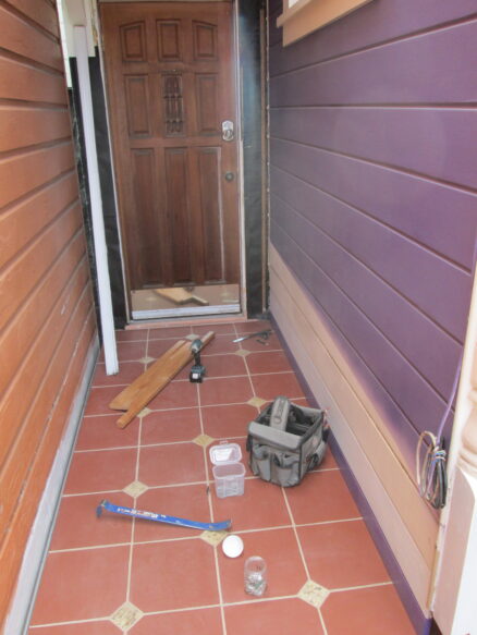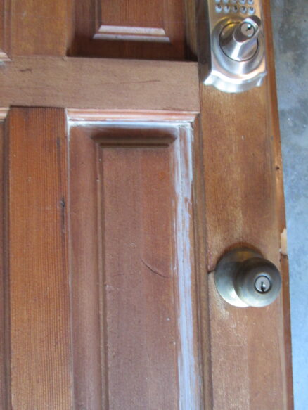 This door has many problems, quite apart from the severe weathering. It looks like it got broken into at one point (!), and is held together with nails and white caulk.