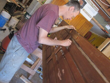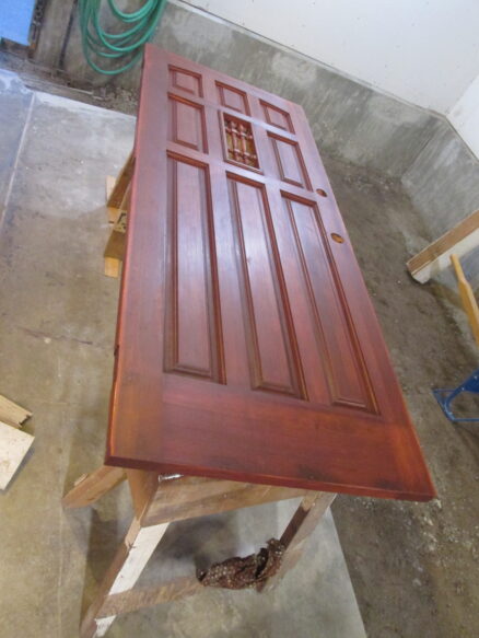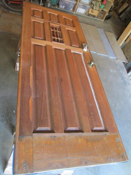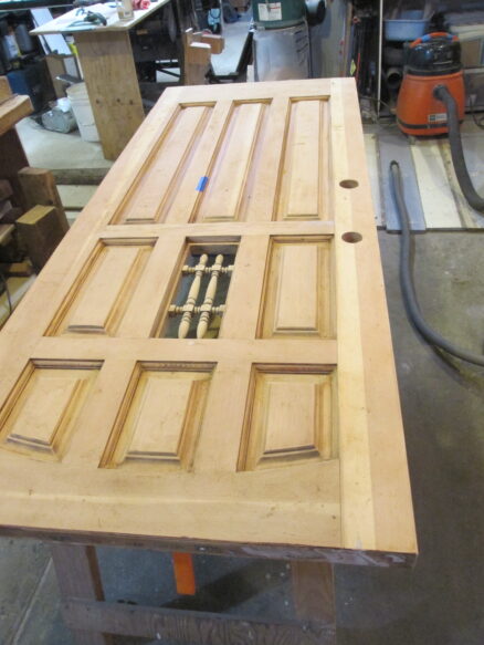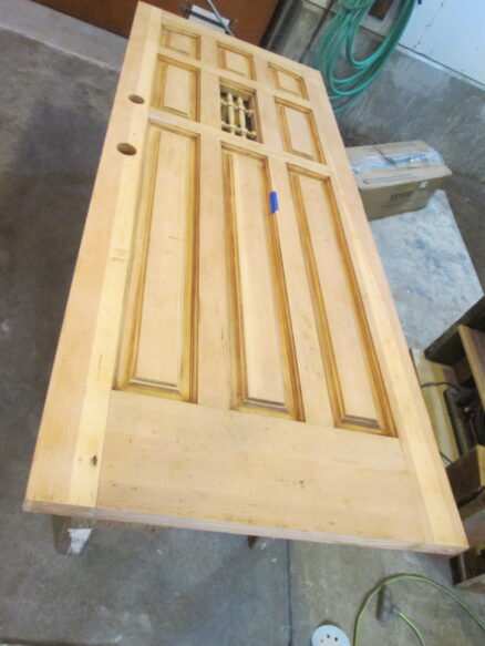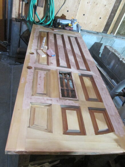 Now the massively time consuming part. There are so many nooks and crannies on this door, sanding was a seriously labor intensive activity. I also had to fill a lot of areas, and made a new piece of trim to match where part of the door panel had been broken.