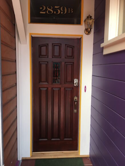 Many (seven!) months later, I finally got round to finishing the sanding. For all that time, I had a temporary door in. There’s nobody living in that unit, so the door isn’t in use anyway.