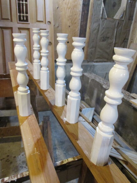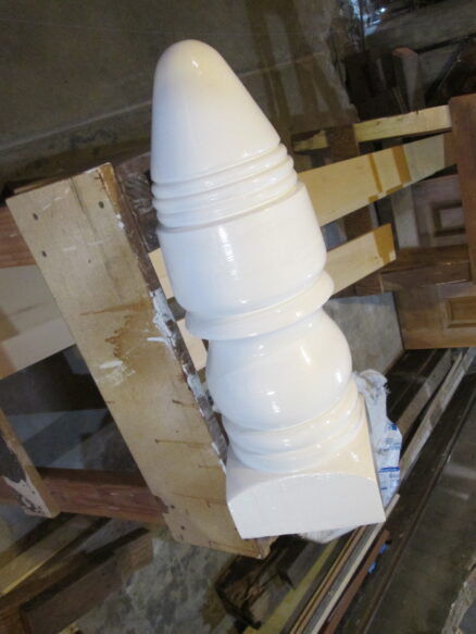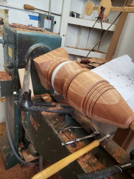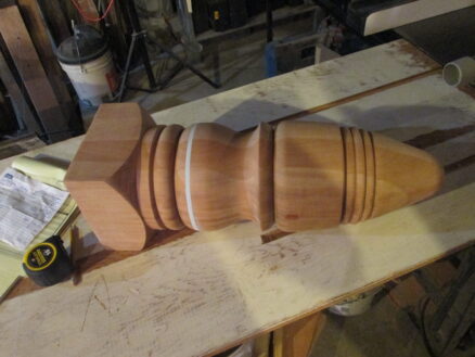 I had a custom newel post made by a local craftsman (Mukesh Prasad from http://americanwoodturning.co/) Here’s a photo he sent me while he was working on it:
